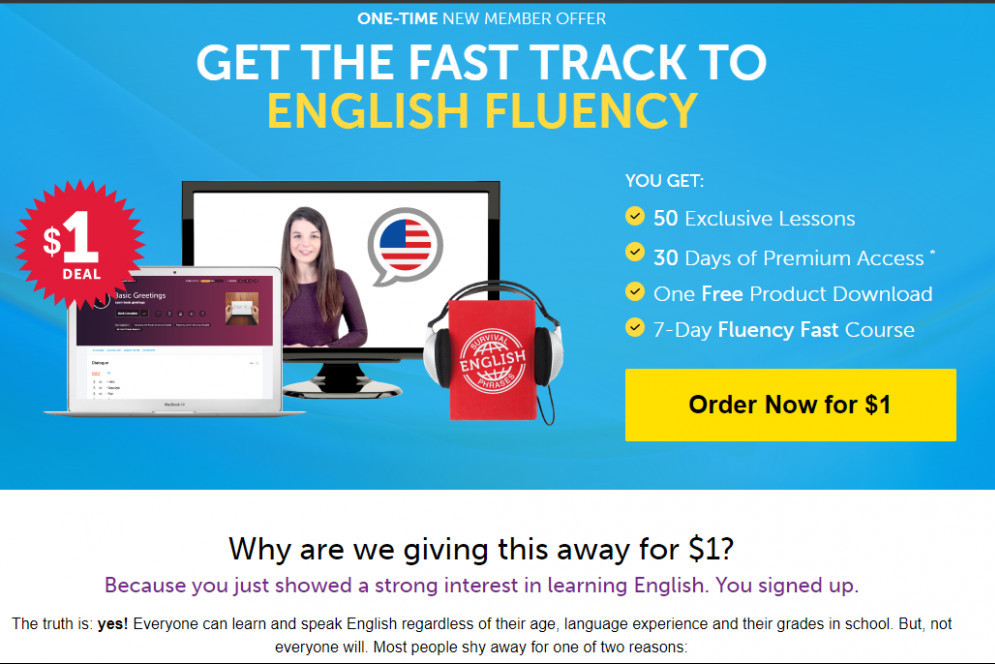 You will be taken to a page that offers you a boatload of tools if you sign up for the fast track to fluency for $1. You can decline it if you like, although I can’t understand why you would.